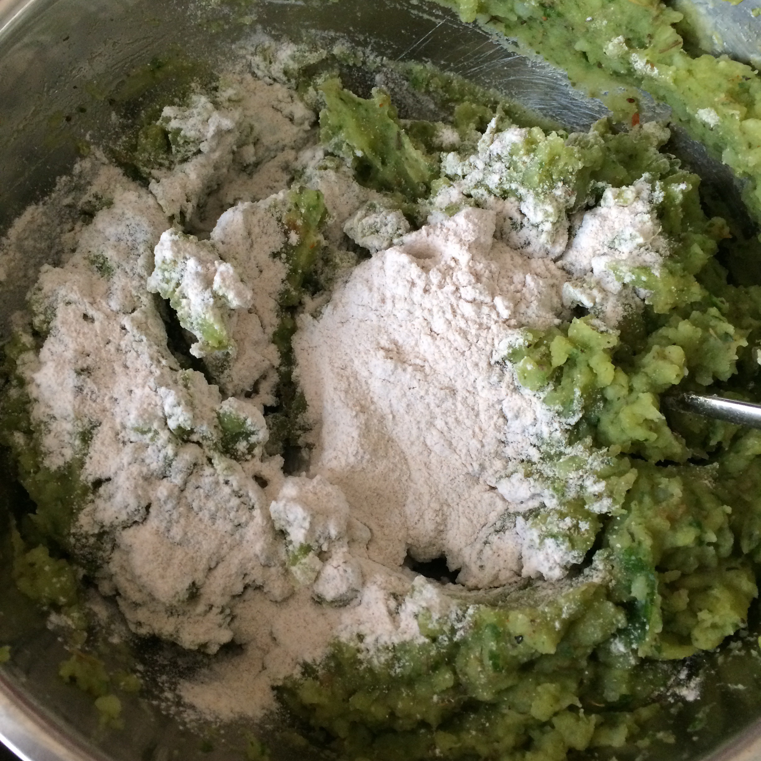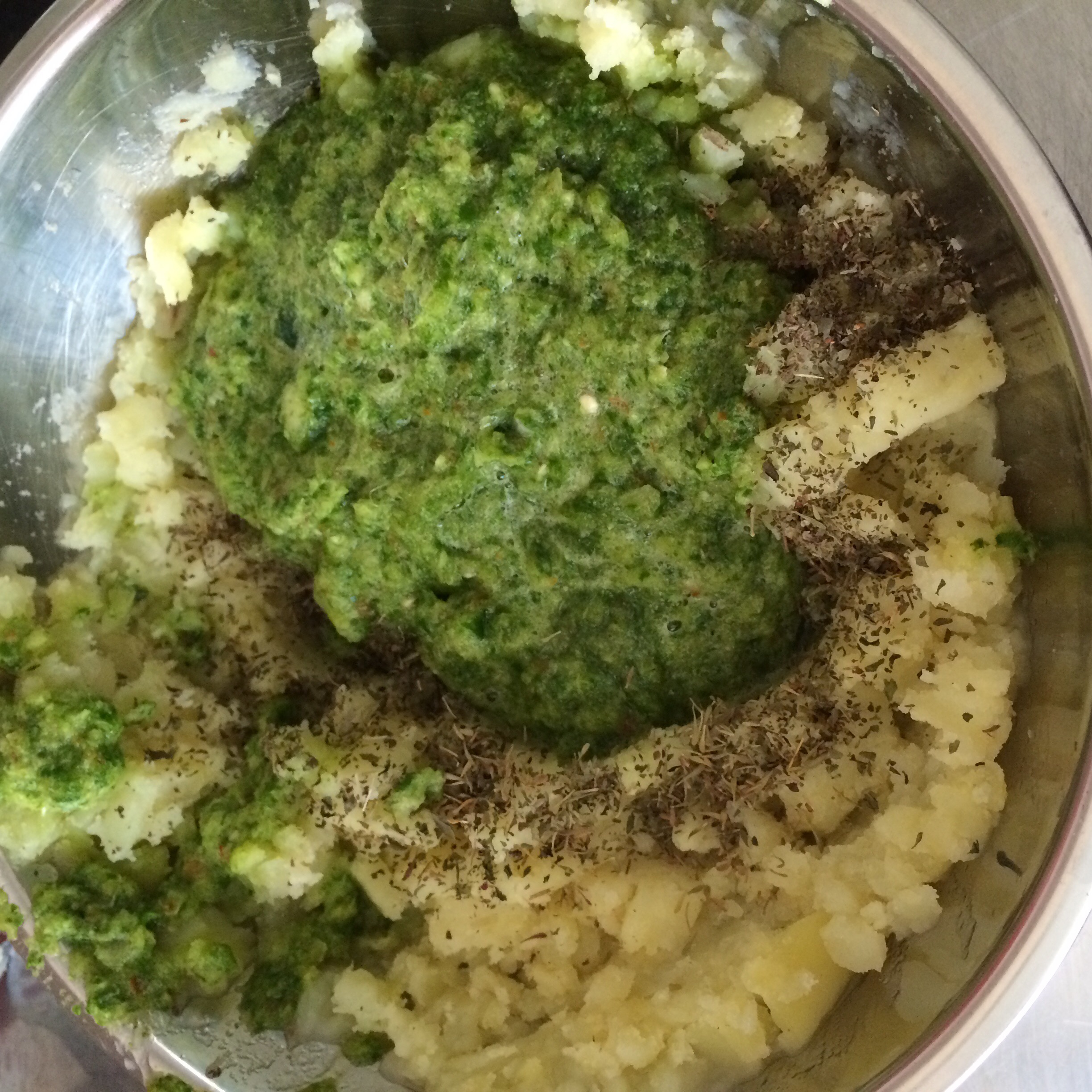 Pour in now, the spinach, pepper, onion and garlic mixture too;And stir and mash again until the mix is completely green right through!    Now add the flour which will make the mixture thicker,