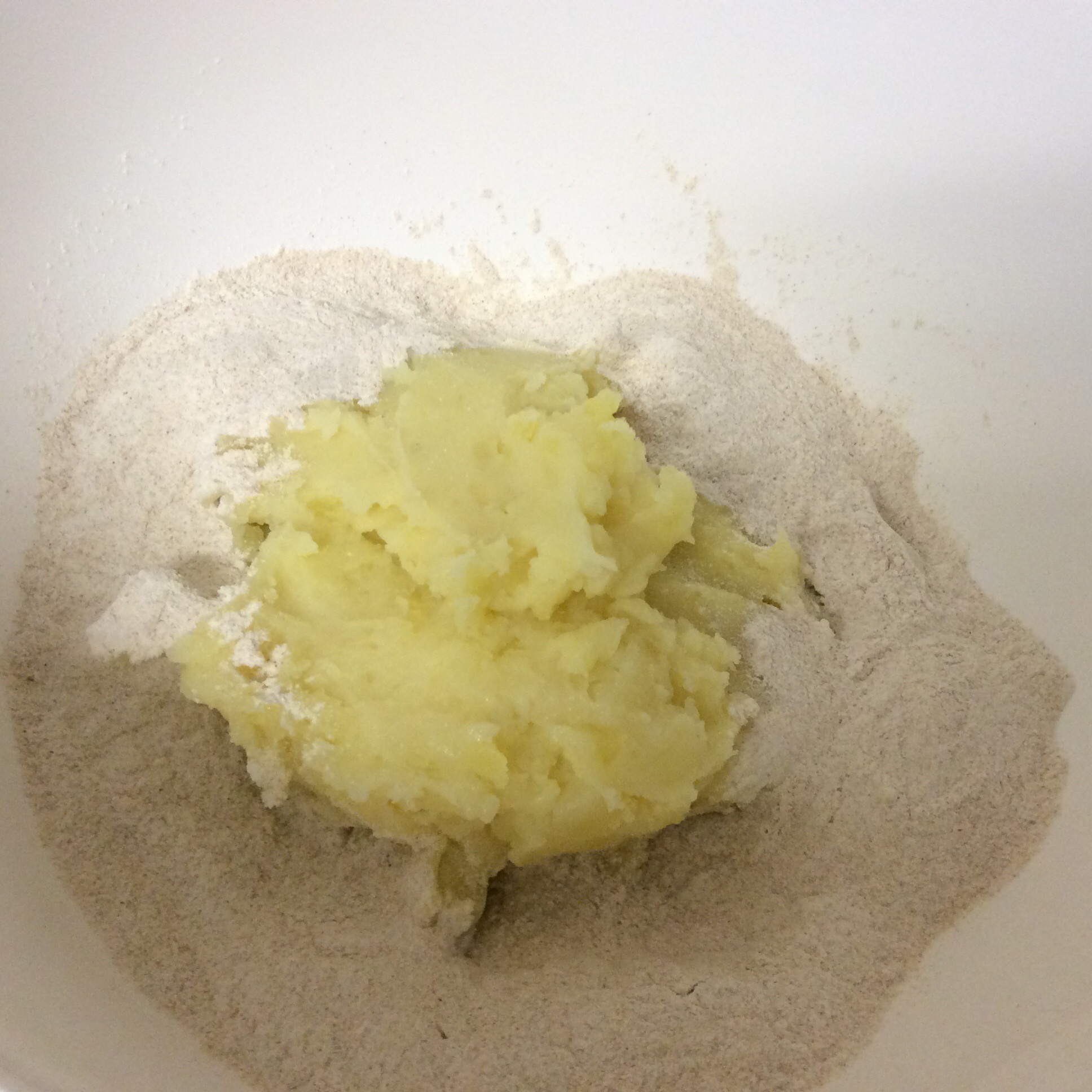…your fluffy potato, add to the centre in a ball……and knead the flour into the potato here’s what it should look like in all…