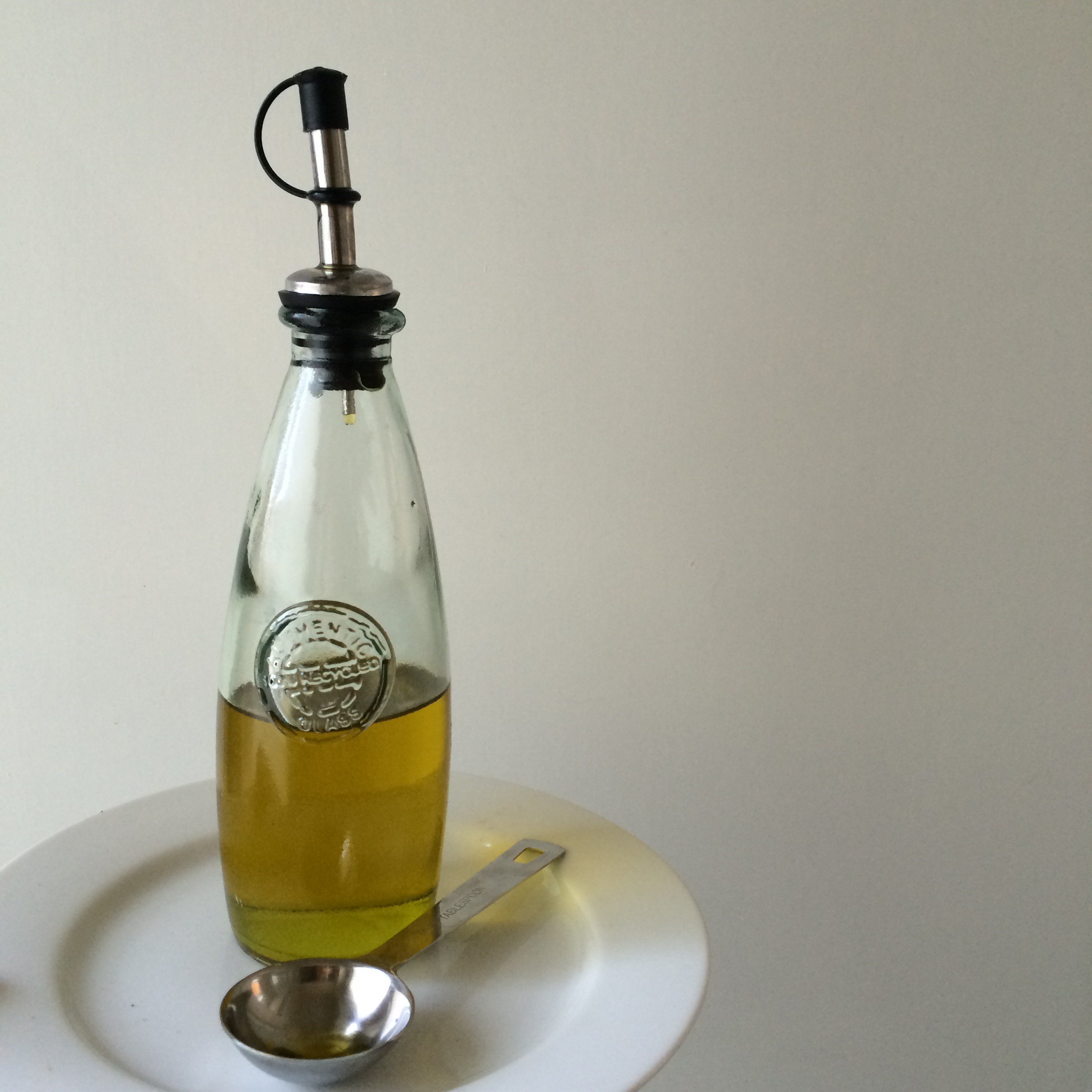 Olive oil in our recycled glass jar ready to pour out 4 tablespoons…